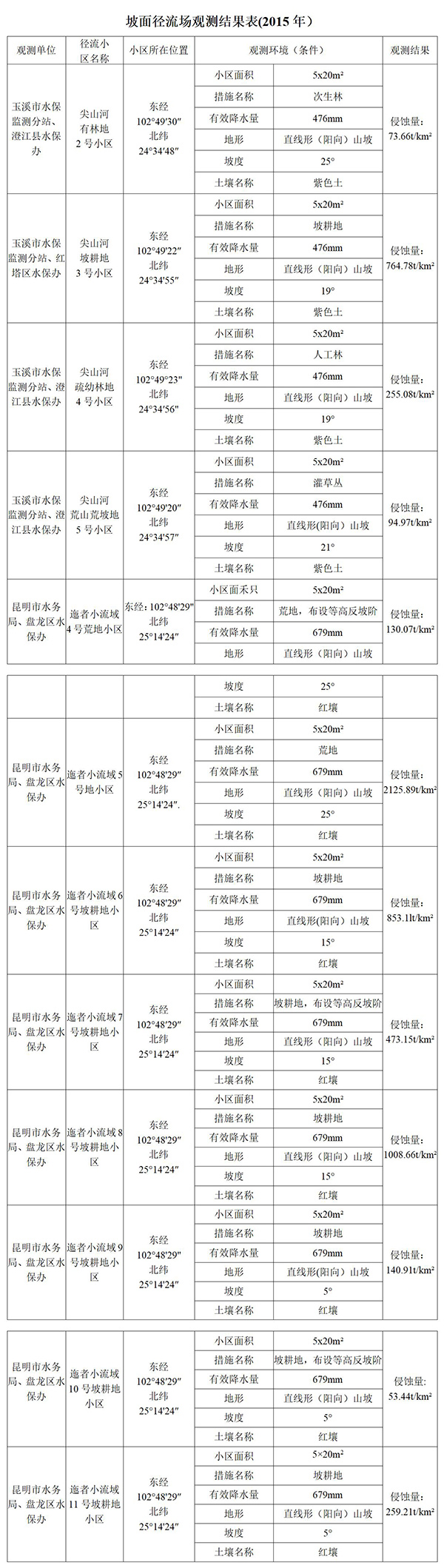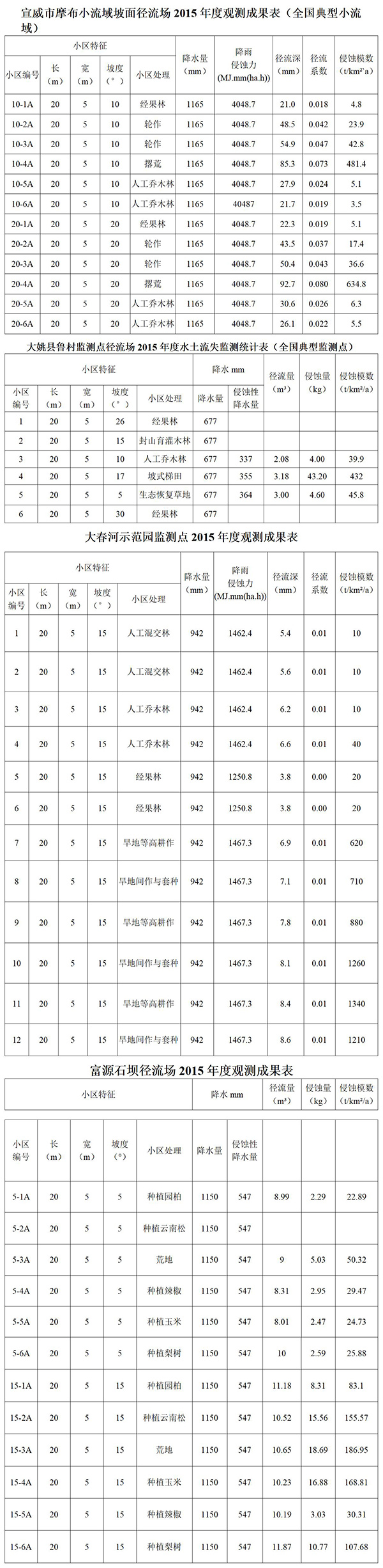 我省宣威市摩布小流域、大姚縣魯村監(jiān)測點(diǎn)、大春河示范園監(jiān)測點(diǎn)、富源石壩徑流場列入全國水土流失動態(tài)監(jiān)測與公告項(xiàng)目。按照該項(xiàng)目的管理規(guī)定和技術(shù)要求,2015年度監(jiān)測成果如下: