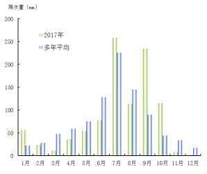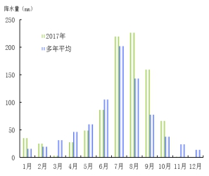 2017年全市平均降水量890.2 mm,比2016年多0.2%,較多年平均值多2.8%。