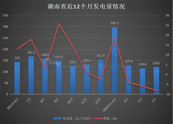5月份,湖南省總發(fā)電量120.2億千瓦時,同比減少8.2%;其中,火力發(fā)電量46.8億千瓦時,同比減少12%;水力發(fā)電量62.2億千瓦時,同比減少5.4%;風力發(fā)電量9.6億千瓦時,同比減少11.3%;太陽能發(fā)電1.61億千瓦時,同比增長29.3%。