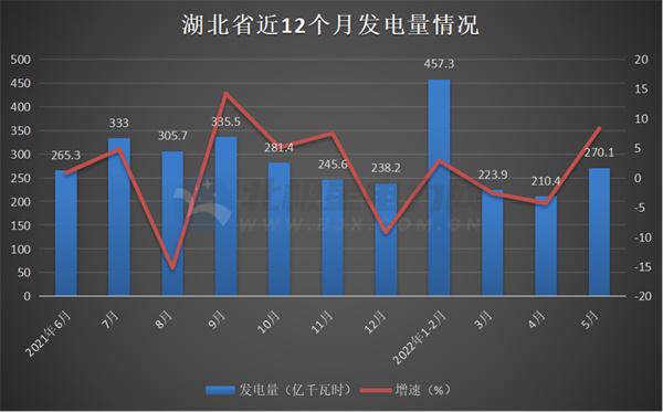 5月份,湖北省總發(fā)電量270.1億千瓦時,同比增長8.3%;其中,火力發(fā)電量71.8億千瓦時,同比減少25.5%;水力發(fā)電量181.1億千瓦時,同比增長30.4%;風力發(fā)電量11.3億千瓦時,同比增長21.8%;太陽能發(fā)電5.89億千瓦時,同比增長23.8%。