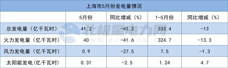 2022年1-5月,上海市總發(fā)電量333.4億千瓦時,同比降低13%,其中火力發(fā)電量324.7億千瓦時,風(fēng)力發(fā)電量7.5億千瓦時,太陽能發(fā)電1.24億千瓦時。
