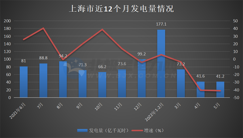 2022年5月份,上海市總發(fā)電量41.2億千瓦時,同比降低41.2%,其中火力發(fā)電量40億千瓦時,風(fēng)力發(fā)電量0.9億千瓦時,太陽能發(fā)電0.31億千瓦時。