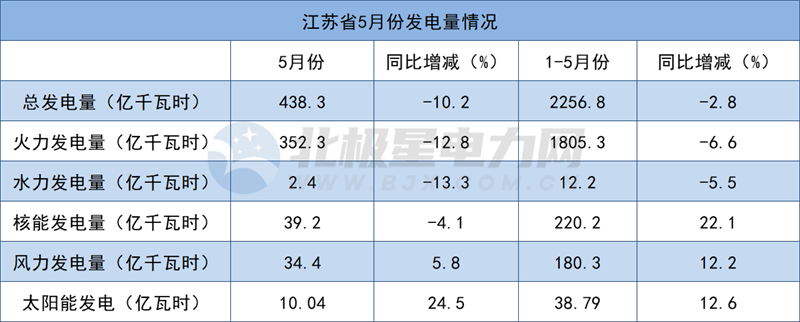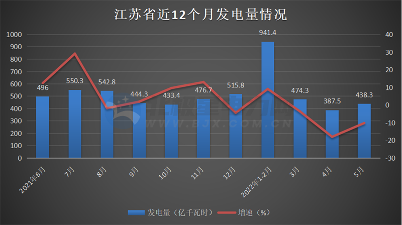 2022年5月份,江蘇省總發(fā)電量438.3億千瓦時,同比降低10.2%,其中火力發(fā)電量352.3億千瓦時,水力發(fā)電量2.4億千瓦時,核能發(fā)電量39.2億千瓦時,風(fēng)力發(fā)電量34.4億千瓦時,太陽能發(fā)電10.04億瓦時。