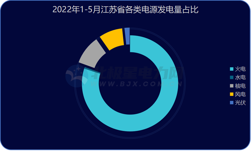 2022年1-5月,江蘇省總發(fā)電量2256.8億千瓦時,同比降低2.8%,其中火力發(fā)電量1805.3億千瓦時,水力發(fā)電量12.2億千瓦時,核能發(fā)電量220.2億千瓦時風(fēng)力發(fā)電量180.3億千瓦時,太陽能發(fā)電38.79億瓦時。