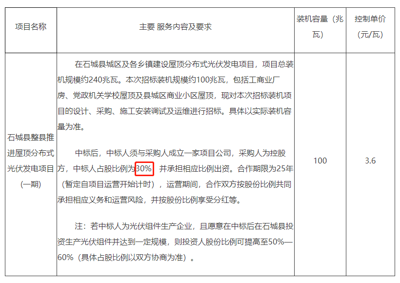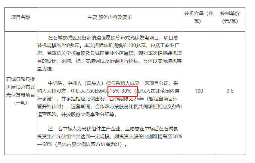 石城縣整縣推進屋頂分布式光伏發(fā)電項目(一期),在石城縣城區(qū)及各鄉(xiāng)鎮(zhèn)建設(shè)屋頂分布式光伏發(fā)電項目,項目總裝機規(guī)模約240兆瓦。本次招標裝機規(guī)模約100兆瓦,包括工商業(yè)廠房、黨政機關(guān)學校屋頂及縣城區(qū)商業(yè)小區(qū)屋頂,控制單價為3.6元/瓦。