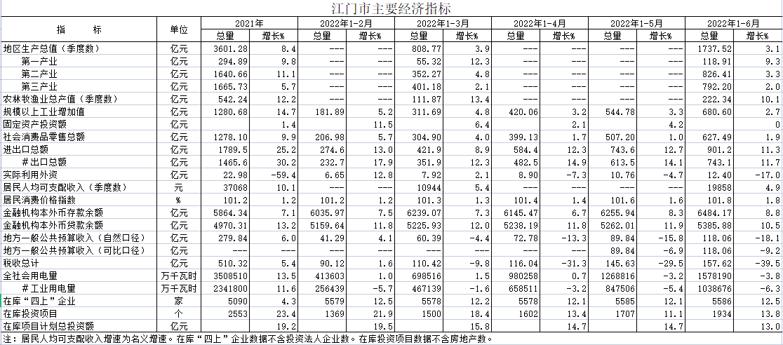(廣東省)江門市2022年上半年主要經(jīng)濟(jì)指標(biāo)