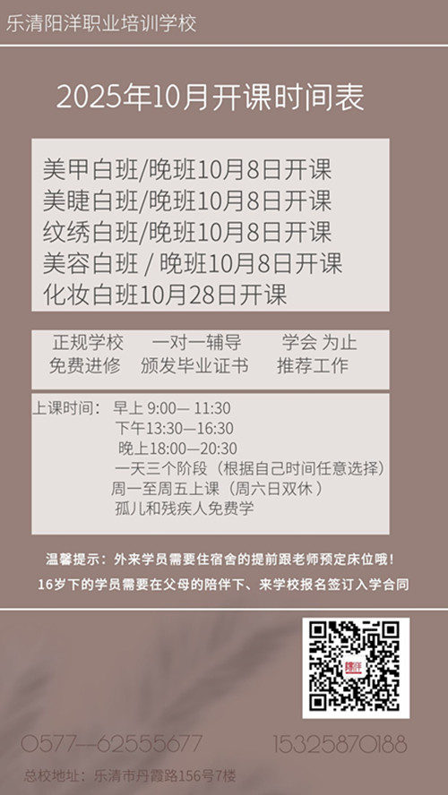 當(dāng)前位置:樂(lè)清市陽(yáng)洋職業(yè)技能培訓(xùn)學(xué)校 » 學(xué)校新聞2025年10月開(kāi)課時(shí)間表|樂(lè)清哪里有學(xué)化妝|柳市哪里有學(xué)化妝|虹橋哪里有學(xué)化妝|學(xué)化妝多少錢(qián)|發(fā)布時(shí)間:2025-9-29 16:00:06 瀏覽次數(shù):55 |